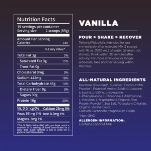 Το Tailwind Rebuild είναι το πρώτο ποτό για αναδόμηση και αποκατάσταση του αθλητή. Βασίζεται σε άριστη οργανική πρωτεΐνη ρυζιού την οποία συμπληρώνουμε με αμινοξέα. Στη συνέχεια, προσθέτουμε υδατάνθρακες, μερικά υγιή λίπη από γάλα καρύδας, και ακριβώς τη σωστή ποσότητα ηλεκτρολυτών. Τίποτα δεν θα αναδομήσει τους μυς σας πιο αποτελεσματικά, αποκαθιστώντας την ενέργεια σας γρηγορότερα, κάνοντας σας να νιώθετε καλύτερα πιό γρήγορα.